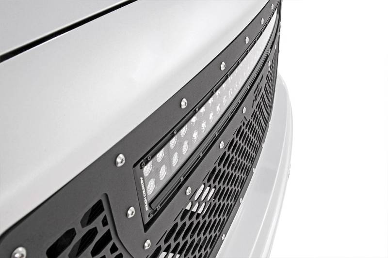 Give the front-end of your GMC 1500 a unique look with Rough Country's Mesh Grille kit. This grille replacement kit'swaps out your stock grille with the eye-catching, head-turning good looks of this aftermarket upgrade. With a unique, laser-cut mesh pattern surrounded by stylish, stainless steel rivets, this grill gives your truck a more menacing look that's sure to draw attention. Each kit is powdercoated black to resist corrosion and give a long lifespan of good looks.This kit features a Rough Country's 30" Curved Dual-Row Black-Series LED light bar with Cree LED's outputting a staggering 14,400 Lumens and 180 Watts of lighting power. Includes a mountable on/off switch, wiring harness, and our 3 Year Warranty!