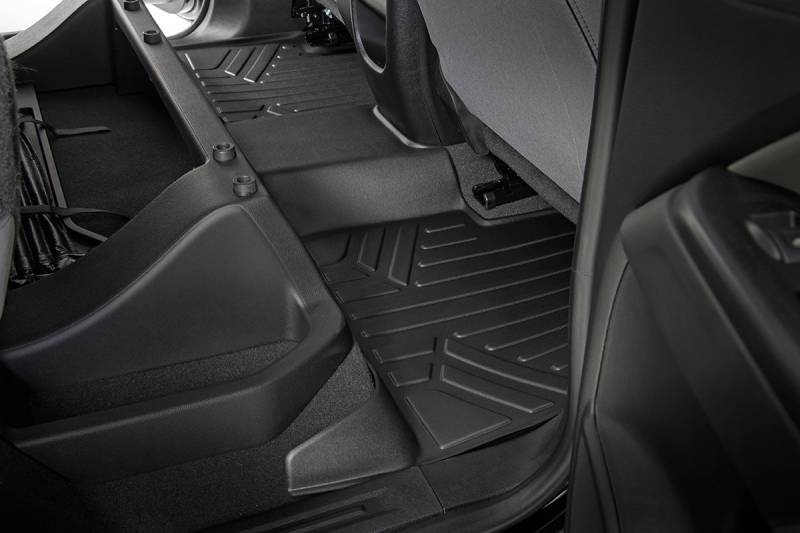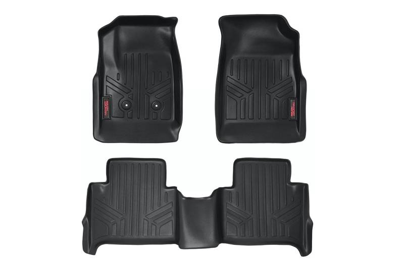 Keep your carpet in pristine condition with Rough Country's Floor Armor: Heavy Duty Floor Mats and Rear Cargo Liners. These eco-friendly, semi-flexible floor mats are made of an ultra-durable Polyethylene that offers a strong, rigid shape that's incredibly easy to clean.\ Where simple rubber floor mats fail, Rough Country's line of Floor Armor is guaranteed for life and will never crack, split, or break-down over time. The high-quality design extends the lifespan of your carpets and the raised-lip design ensures your interior will always be protected from mud, moisture, and more.\ These contoured floor mats are laser-measured for each make and model; designed to be a precise fit that grips the carpet and stays put. An aggressive looking textured surface gives your muddy shoes plenty of traction and looks great inside the vehicle.\ No matter what you track in, Rough Country Floor Armor is incredibly easy to clean. Just pop them out of the floorboards and rinse away the dirt! Includes Rough Country's Lifetime Replacement Warranty.