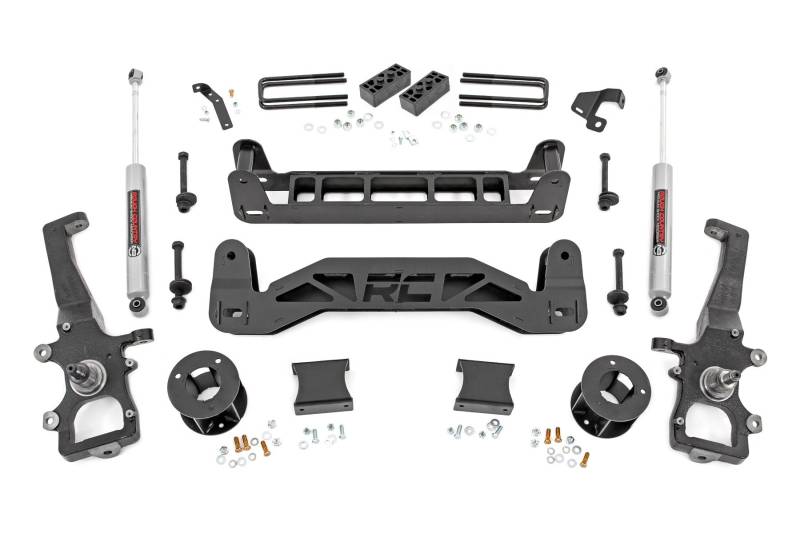 Transform your 2004-2008 Ford F-150 2WD with Rough Country's 4-inch Suspension Lift, giving it an aggressive new look and boosting off-road performance like never before. This all-inclusive kit is engineered to elevate your Ford, providing the perfect balance of strength and style on any trail.Achieve Enhanced Ride Height and Stability: With durable lifted knuckles and strut spacers, you'll gain the ride height needed to run up to 35-inch tires with proper wheel backspacing, all while maintaining Track Width Consistency for improved handling and stability.Upgrade Your Vehicle's Performance: This kit includes Cam Bolts, Brackets, Sway-Bar Drop Brackets, and Brake Line Brackets, ensuring all components stay at optimal angles for a factory-like ride. The 1/4-inch thick plate steel front and rear crossmember enhances your truck's strength and gives it a bold, stylish appearance.Includes Rough Country's N3 Rear Shocks: This kit comes complete with Rough Country's N3 rear shocks for enhanced ride quality and improved suspension performance. These premium shocks are engineered to deliver superior damping, increased stability, and all-terrain comfort, making your F-150 ready for any adventure right out of the box. Enjoy Peace of Mind: Backed by Rough Country's Limited Lifetime Replacement Warranty, you can hit the trails with confidence, knowing that your investment is covered for the long haul.