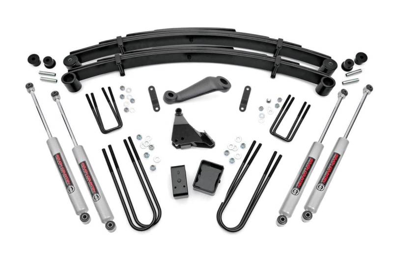 Give your 99-04 Ford Super Duty an impressive upgrade, front to back with Rough Country's 6" Ford Suspension Lift Kit! This easy-to-install lift kit raises the front of your vehicle to be equal height with the rear for a leveled, better-than-stock look that gives an improved ride height and more aggressive appearance.\ This kit features a set of front lifted leaf springs allowing you gain additional ride height without sacrificing ride quality or performance. A set of sway bar drop brackets and track bar bracket are provided to keep everything at optimum angles for a factory-like ride, even after lifting.\ A set of Rough Country's premium N3 shocks are also included. These fine tuned 10-stage variable high-pressure Nitrogen charged shocks offer a fantastic blend of off-road action and smooth highway ride quality. With a durable 18mm spring-loaded piston rod and faster-cooling 54mm shock body.\ Get the wheels you want! Rough Country's 6" 99-04 Ford Suspension Lift Kit comes with everything you need to fit up to a 37" tire with proper wheel backspacing.\ Best of all, Rough Country's 6" Ford Suspension Lift Kit is backed by our Lifetime Replacement Warranty.