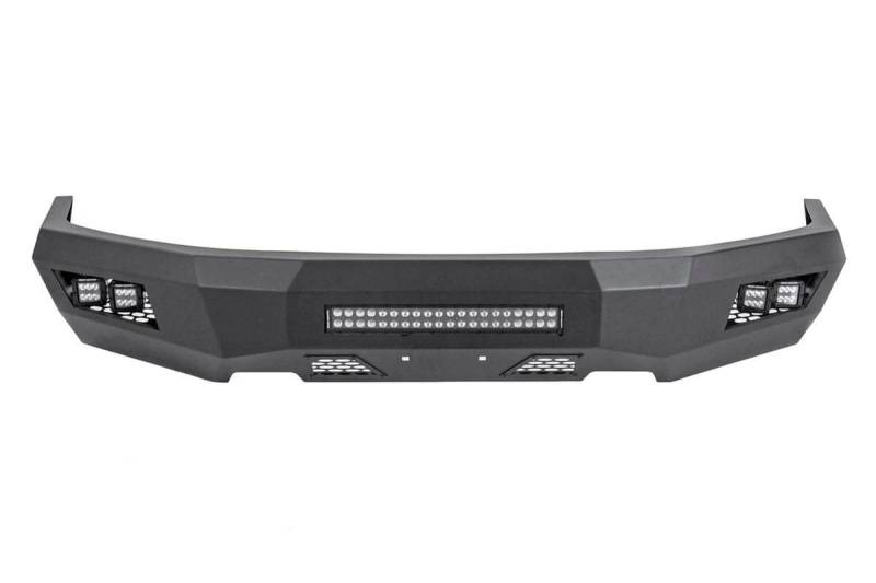 Aggressive Styling with Functional Protection: Instantly transform the front end of your Ford F-150 with Rough Country's Front LED Bumper. This bold upgrade delivers a rugged off-road look while adding dependable protection against trail hazards, road debris, and everyday abuse.High-Output Integrated LED Lighting: Designed to dominate the dark, this bumper comes equipped with four Rough Country 2in LED Cubes and a powerful 20in LED Light Bar. Together, they produce an impressive 19200 lumens of combined lighting output, dramatically improving visibility during nighttime driving and off-road adventures.Heavy-Duty All-Steel Construction: Built from durable steel, Rough Country's Front LED Bumper is engineered to handle harsh conditions on and off the trail. A flat black powder coat finish provides long-lasting corrosion resistance while maintaining a clean, aggressive appearance.Retains Factory Safety and Recovery Features: This bumper is designed to retain factory tow hooks and includes sensor relocators to maintain full functionality of your F-150's factory proximity and anti-collision systems.Simple Installation and Warranty Coverage: Designed for an easy bolt-on installation using factory mounting locations, this bumper installs with no cutting or drilling required. The included LED lights are backed by a 3-year warranty, while the bumper features a 1-year finish warranty and a limited lifetime warranty against manufacturing defects.