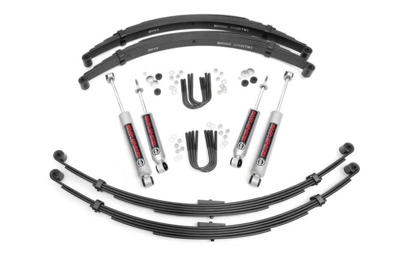 Give your Scout an aggressive look from front to rear with Rough Country's 4" International Suspension Lift System! This easy-to-install leveling kit raises the front of your vehicle to be equal height with the rear for a leveled, flush look that gives a better ride height and more aggressive appearance.\ This kit features a set of front and rear, durable leaf springs allowing you gain additional ride height without sacrificing ride quality or performance.\ A set of Rough Country's premium N3 shocks are also included in this kit. These fine tuned 10-stage variable high-pressure Nitrogen charged shocks offer a fantastic blend of off-road action and smooth highway ride quality. With a durable 18mm spring-loaded piston rod and faster-cooling 54mm shock body.\ Get the wheels you want! Rough Country's International Suspension Lift System comes with everything you need to fit up to a 33" tire with proper wheel backspacing.\ Best of all, Rough Country's 4" International Suspension Lift System is backed by our Lifetime Replacement Warranty.