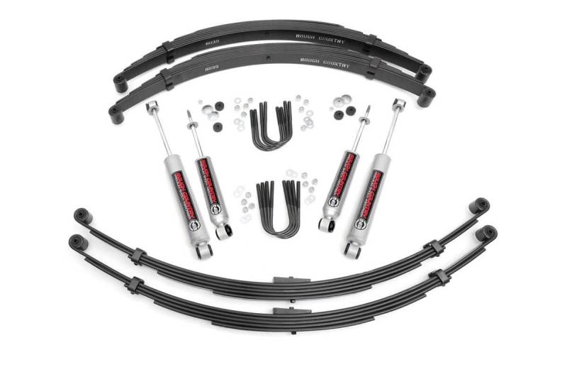Give your Scout an aggressive look from front to rear with Rough Country's 2.5" International Suspension Lift System! This easy-to-install leveling kit raises the front of your vehicle to be equal height with the rear for a leveled, flush look that gives a better ride height and more aggressive appearance.\ This kit features a set of front and rear, durable leaf springs allowing you gain additional ride height without sacrificing ride quality or performance.\ A set of Rough Country's premium N3 shocks are also included in this kit. These fine tuned 10-stage variable high-pressure Nitrogen charged shocks offer a fantastic blend of off-road action and smooth highway ride quality. With a durable 18mm spring-loaded piston rod and faster-cooling 54mm shock body.\ Get the wheels you want! Rough Country's International Suspension Lift System comes with everything you need to fit up to a 32" tire with proper wheel backspacing.\ Best of all, Rough Country's 2.5" International Suspension Lift System is backed by our Lifetime Replacement Warranty.