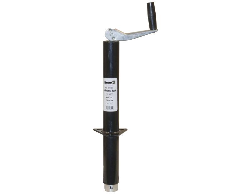 The A-Frame Jack from Buyers Products is designed to bolt onto an A-frame coupler. Its ergonomic top-wind design makes it easy to operate. It features a 15" travel and a weight capacity of 2,000 lbs. Support foot not included, jack only.