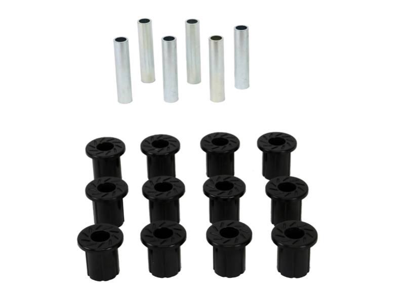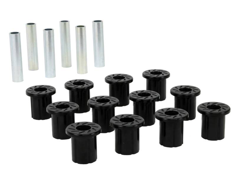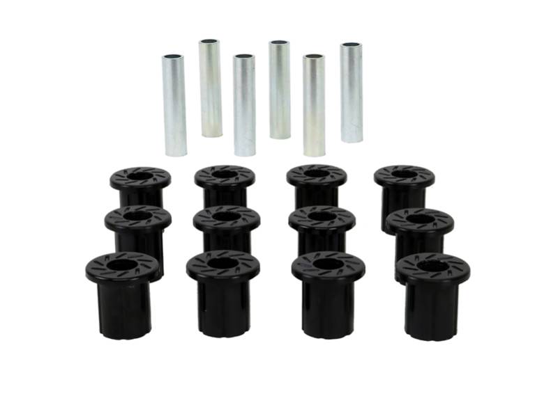 All in one leaf spring bushing service kit covering front and rear eyes of the leaf plus shackle bushings. High kilometres and heavy load carrying causes excessive wear on rubber bushings. Nolathane's signature black bushings are made tough and offer outstanding abrasion resistance, high load bearing capability (4WD's, utes and towing), flexibility, increased tensile strength and chemical resistance to oil, grease, ozone and weathering.\nWith over 40 years of history, Nolathane remains the number 1 replacement and enhancement bushing and chassis component brand throughout Australia & New Zealand and now boasts a warehouse in California & catalog to suit the North American market.