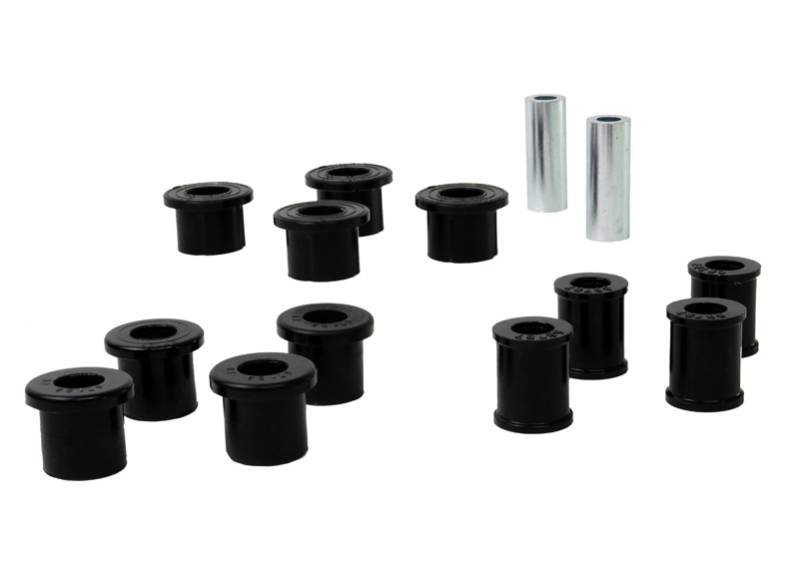 All in one leaf spring bushing service kit covering front and rear eyes of the leaf plus shackle bushings. High kilometres and heavy load carrying causes excessive wear on rubber bushings. Nolathane bushings are made tough and offer outstanding abrasion resistance, high load bearing capability (4WD's, utes and towing), flexibility, increased tensile strength and chemical resistance to oil, grease, ozone and weathering.\nWith over 40 years of history, Nolathane remains the number 1 replacement and enhancement bushing and chassis component brand throughout Australia & New Zealand and now boasts a warehouse in California & catalog to suit the North American market.