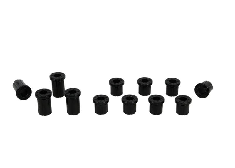All in one leaf spring bushing service kit covering front and rear eyes of the leaf plus shackle bushings. High kilometres and heavy load carrying causes excessive wear on rubber bushings. Nolathane's signature black bushings are made tough and offer outstanding abrasion resistance, high load bearing capability (4WD's, utes and towing), flexibility, increased tensile strength and chemical resistance to oil, grease, ozone and weathering.\nWith over 40 years of history, Nolathane remains the number 1 replacement and enhancement bushing and chassis component brand throughout Australia & New Zealand and now boasts a warehouse in California & catalog to suit the North American market.