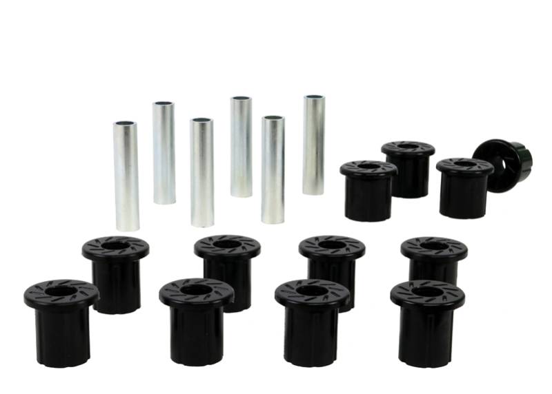 With over 40 years of history, Nolathane remains the number 1 replacement and enhancement bushing and chassis component brand throughout Australia & New Zealand and now boasts a warehouse in California & catalog to suit the North American market.\nAll in one leaf spring bushing service kit covering front and rear eyes of the leaf plus shackle bushings. High kilometres and heavy load carrying causes excessive wear on rubber bushings. Nolathane's signature black bushings are made tough and offer outstanding abrasion resistance, high load bearing capability (4WD's, utes and towing), flexibility, increased tensile strength and chemical resistance to oil, grease, ozone and weathering.