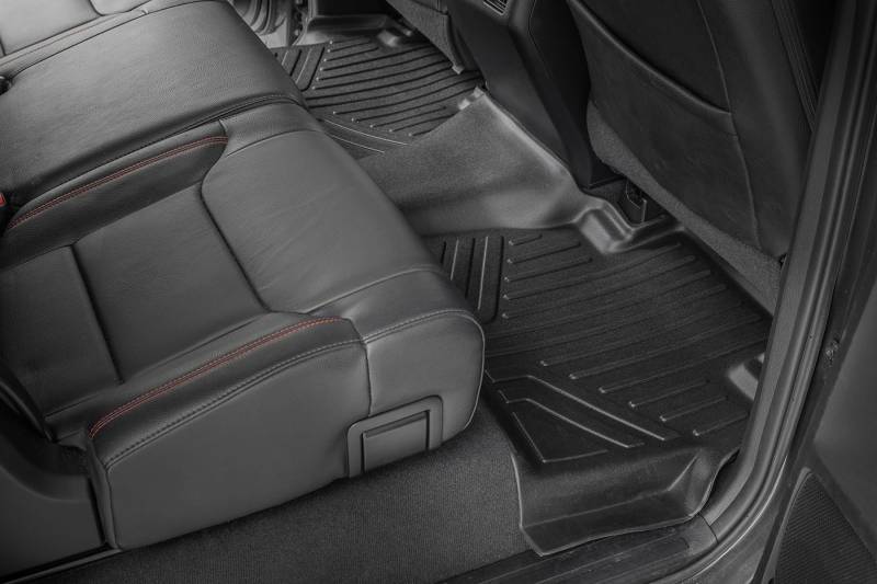 Keep your carpet in pristine condition with Rough Country's Floor Armor: Heavy Duty Floor Mats and Rear Cargo Liners. These eco-friendly, semi-flexible floor mats are made of an ultra-durable Polyethylene that offers a strong, rigid shape that's incredibly easy to clean.\ Where simple rubber floor mats fail, Rough Country's line of Floor Armor is guaranteed for life and will never crack, split, or break-down over time. The high-quality design extends the lifespan of your carpets and the raised-lip design ensures your interior will always be protected from mud, moisture, and more.\ These contoured floor mats are laser-measured for each make and model; designed to be a precise fit that grips the carpet and stays put. An aggressive looking textured surface gives your muddy shoes plenty of traction and looks great inside the vehicle.\ No matter what you track in, Rough Country Floor Armor is incredibly easy to clean. Just pop them out of the floorboards and rinse away the dirt! Includes Rough Country's Lifetime Replacement Warranty.