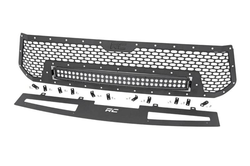 Give the front-end of your Toyota Tundra a unique look with Rough Country's Mesh Grille kit. This grille replacement kit'swaps out your stock grille with the eye-catching, head-turning good looks of this aftermarket upgrade. With a unique, laser-cut mesh pattern surrounded by stylish, stainless steel button-head bolts, this grill gives your truck a more menacing look that's sure to draw attention. Each kit is powder coated black to resist corrosion and give a long lifespan of good looks.This kit features a Rough Country's 30" Curved Dual-Row Black-Series LED light bar with Cree LED's outputting tremendous lighting power. Includes a mountable on/off switch, wiring harness, and our 3 Year Warranty!\ \