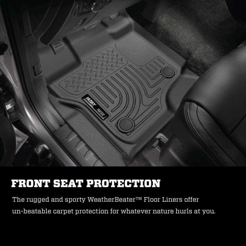 Weatherbeater - 2nd Seat Floor Liner The original all-weather liner is ready, come hell or hot coffee. The Weatherbeater?s construction is a no-slip zone with zero edge curl, and its Stay Put Nibs keep it firmly anchored underfoot. It stands up to chemicals like gas, oil and battery acid, and stays tough and flexible, even under extreme temperatures. Its laser-scanned, FormFit Design? gives your truck, van or SUV an ultra-clean look with easy cleanup to match, while its patented, FormFit Edge? keeps spills contained, carpets unstained. It?s unbeatable Husky protection for life, warrantied the same. Proudly made in the USA. Our patented FormFit Design(TM) process gives you a glove-like, laser-tight fit to your make and model. Floorboards are 3D scanned to precisely match the contours of your vehicle. Our patented FormFit Edge(TM) features a raised ridge that runs along the door jam, protecting your truck, van, or SUV from all manner of muck. Over vinyl or carpet, our StayPut(TM) Cleats firmly lock to your factory anchors. It's rock-steady stability underfoot, only by Husky. Sporty, rugged, and built for a lifetime of non-stop abuse. Put unbeatable all-weather toughness to work on your floor. WeatherBeater(TM) Liners offer protection that extends all the way to your rear seats. So go ahead, lift the seats and leave them up, load after load. Husky's got your floors, and your back, no matter what the road brings your way.
