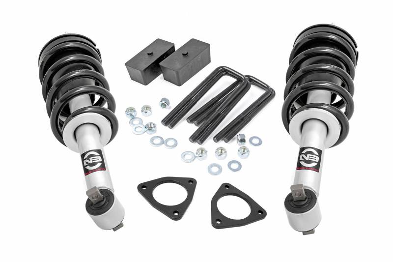 Lift Your Limits Without Breaking the Bank: Rough Country's 2.5-inch Suspension Lift Kit for Chevy Silverado or GMC Sierra 1500 pickups delivers off-road capability and clean street styling-without the high price tag. Designed for those who want more than a basic leveling kit, this system combines 2-inch lower strut extensions, strut spacers, and upgraded rear blocks for a true 2.5-inch lift-enough clearance to run up to a 285/70/17 tire with confidence.Preserve Factory Comfort with an Aggressive Stance: Maintain the smooth, factory-like ride you love while achieving a leveled front-to-rear look. Whether on the road or trail, this kit offers enhanced ground clearance with no compromise in handling or ride quality.Fully Configurable with Optional Strut Replacements: Choose the ride feel that suits your style-this kit is available with direct-fit replacement struts, including nitrogen-charged N3s or premium Vertex reservoir options. Whether you want a comfort-focused setup or performance-tuned damping, we've got you covered.Engineered for Strength, Built for Simplicity: Say goodbye to cast blocks-our upgraded 2-inch rear blocks are precision-crafted for durability and a secure, exact fit. With a fully bolt-on installation that requires no cutting, drilling, or strut compressor (excluding models equipped with lower stamped steel control arms), this kit installs quickly and easily in your own garage.Take on the Terrain with More Clearance and Control: Whether you're upgrading for style, clearance, or trail performance, Rough Country's 2.5-inch Lift Kit gives you the capability and stance your truck deserves-without the premium price.