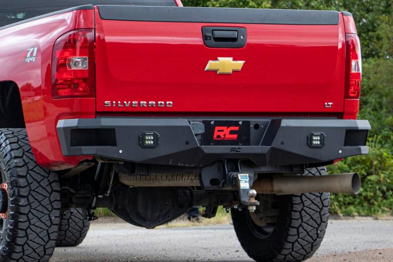 Bold Rear-End Style and Protection: Instantly upgrade the look and capability of your Chevy/GMC 2500HD and 3500HD with Rough Country's Rear LED Bumper. Designed to deliver a more aggressive, trail-ready appearance, this heavy-duty upgrade enhances both protection and functionality while maintaining a clean, factory-inspired fit.High-Output Rear Lighting Built In: Equipped with two Rough Country Black-Series 2-inch flush mount LED cube lights, this bumper provides a powerful 4800 lumens of rear-facing illumination. Whether backing up in low-light conditions or working around your truck at night, these integrated LEDs deliver dependable visibility right where you need it.Heavy-Duty Steel Construction: Built entirely from durable steel, this rear bumper is engineered to withstand tough jobsite conditions, trail abuse, and everyday wear. A tough black powder coat finish helps protect against corrosion while maintaining a rugged, aggressive look.Integrated Steps for Easy Bed Access: Thoughtfully placed built-in steps on both sides of the bumper make climbing into the bed safer and more convenient, especially when loading gear, tools, or equipment.Factory Features Retained: Unlike many aftermarket options, Rough Country's Rear LED Bumper is designed to retain the factory receiver hitch for towing and accessories. Included backup sensor relocation mounts allow you to maintain proper function of your vehicle's factory anti-collision system after installation.Simple Installation and Warranty Coverage: Designed for an easy bolt-on installation using factory mounting locations, this bumper installs with no cutting or drilling required. The included LED lights are backed by a 3-year warranty, while the bumper features a 1-year finish warranty and a limited lifetime warranty against manufacturing defects.
