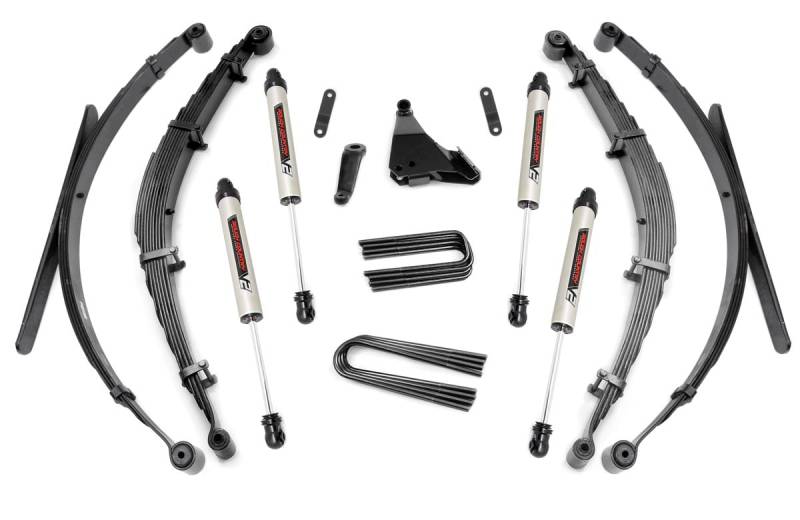Give your 99-04 Ford Super Duty an impressive upgrade, front to back with Rough Country's 6" Ford Suspension Lift System! This easy-to-install lift kit raises the front of your vehicle to be equal height with the rear for a leveled, better-than-stock look that gives an improved ride height and more aggressive appearance.\ This kit features a set of front and rear lifted leaf springs allowing you gain additional ride height without sacrificing ride quality or performance. A set of sway bar drop brackets and track bar bracket are provided to keep everything at optimum angles for a factory-like ride, even after lifting.\ Rough Country's V2 Monotube Shocks are available for this kit. For those off-road hobbyists looking for a good step-up performance shock, the V2 Monotube will improve your ride quality with lighting-fast reaction with no cavitation - just unbridled vibration damping at each and every obstacle.\ Get the wheels you want! Rough Country's 6" 99-04 Ford Suspension System Kit comes with everything you need to fit up to a 37" tire with proper wheel backspacing.\ Best of all, Rough Country's 6" Ford Suspension Lift System is backed by our Lifetime Replacement Warranty.