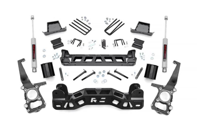 Transform Your Stance. Unleash Off-Road Performance: Give your 2WD 2011-2014 Ford F-150 a bold new look and exceptional trail-ready capability with Rough Country's 6-Inch Suspension Lift Kit. Engineered for strength, style, and performance, this all-inclusive package has everything you need to dominate off the pavement.Aggressive Lift with Factory Geometry: This kit maintains your factory track width, ensuring proper alignment and handling without compromising safety or performance.Command More Ground Clearance: Gain the elevation needed to conquer rough terrain and run up to 35-inch tires with confidence.Perfectly Balanced Stance: Level the front end with the rear for a clean, aggressive profile that enhances both appearance and functionality.Stronger, Smarter Rear Blocks: Fabricated rear lift blocks provide superior durability over cast iron alternatives and are engineered to prevent axle wrap, preserving ride quality and driveline integrity.Anti-Axle Wrap Technology: Specially designed rear blocks eliminate common lift block issues while maintaining a smooth, stock-like ride.Premium N3 Rear Shock Absorbers: Application-specific N3 shocks deliver unmatched off-road performance with enhanced ride comfort and control.Built to Last with Bold Looks: High-clearance front and rear crossmembers made from 1/4-inch plate steel feature laser-cut "RC" logos and a straightforward installation process, no cutting or drilling required.Peace of Mind: Like all Rough Country suspension systems, this lift kit is backed by a Limited Lifetime Replacement Warranty for long-term confidence.