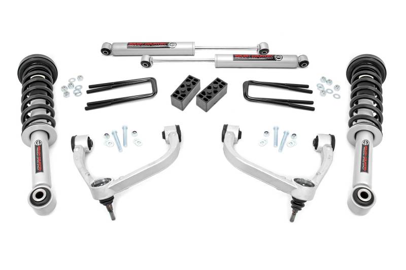 Upgrade your truck with an unbeatable combination of aggressive good looks, increased ground clearance, and premium components - all at an incredible value. Designed specifically for the twelfth-generation F-150 models, this kit delivers a hassle-free installation and enhanced performance both on and off the road.Premium Forged Aluminum Control Arms for Maximum Durability: This kit includes high-quality forged aluminum upper control arms, engineered for superior strength and easier alignment adjustments. Built with heavy-duty rubber bushings, these arms ensure long-lasting reliability while maintaining factory-like geometry. By keeping ball joints at optimum angles, they reduce stress and wear, giving your suspension an extended lifespan. Also available with a bold red powder-coated finish for added corrosion resistance and a custom look.Fully Configurable with Shock/Strut Options: Customize your ride with the perfect suspension setup! Choose from nitrogen-charged N3 shocks for a balanced ride or upgrade to premium M1 monotube shocks for maximum performance and adjustability. Whether you're looking for comfort, off-road capability, or high-end damping control, this kit gives you full flexibility to dial in your ride quality.Balanced Stance with Increased Ground Clearance: This 3-inch lift kit levels the front and rear of your truck, eliminating factory rake and giving your F-150 a clean, aggressive stance. The included rear blocks provide additional lift while maintaining a factory-like ride. With this setup, your truck gets ample clearance for up to 34-inch tires without sacrificing drivability.Simple, Bolt-On Installation: Designed for easy installation, this kit features a 100% bolt-on process that can be completed with common tools in a home garage. No need for cutting or drilling - just a straightforward, stress-free upgrade. Plus, if you ever want to return your truck to stock, this kit allows for a full reversal with ease.Built to Last: With its durable construction and premium components, this lift kit is built to handle whatever the road throws your way. Plus, it comes backed by Rough Country's Limited Lifetime Replacement Warranty, ensuring long-term confidence in your investment.