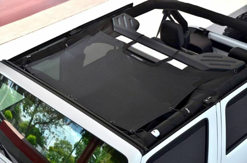 - The SPIDERWEBSHADE for Jeeps is the world’s most effective solution for blocking the sun’s scorching rays from your head, face and neck while drastically reducing the wind noise at highway speeds.