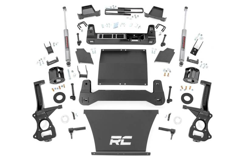 Transform your fifth-generation GMC Sierra 1500 with Rough Country's 6-Inch Suspension Lift Kit, engineered to elevate both your stance and your off-road prowess. Designed to complement the truck's aggressive factory styling, this all-in-one lift solution delivers a bold, leveled look and the clearance needed to run 35x12.50 tires on 10-inch wide wheels.Front-to-Rear Lift & Leveling: Gain a clean, aggressive stance with improved ground clearance for better trail performance and street presence.Precision Engineering, Off-Road Ready: This kit features a high-clearance crossmember that maintains optimal suspension geometry while maximizing off-road capability. Extreme-duty cast knuckles and heavy-duty fabricated blocks provide rugged durability built to endure the harshest driving conditions.Factory Fitment, Simplified Install: Enjoy a bolt-on installation that requires no strut disassembly and no differential trimming, saving you time and preserving the factory integrity of your Sierra. The laser-cut, CAD-designed components ensure a perfect fit and unmatched strength.Retains Stock Handling & Compatibility: With factory track width maintained, you keep the truck's original handling characteristics while minimizing wear and tear. This kit also works with all Rough Country shock/strut options, from nitrogen-charged N3s to the premium Vertex reservoir, so you can tailor your ride to your driving needs. Every kit includes front and rear crossmembers, a durable skid plate for enhanced chassis strength, and Rough Country's Limited Lifetime Replacement Guarantee for complete peace of mind.