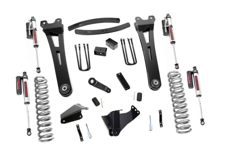 Compliment your 05-07 Ford F-250/350's aggressive, good looks with Rough Country's 6-inch Radius Arm Lift Kit. Rough Country's 6-inch Lift Kit was engineered to retain the F-250/350's impressive factory specs while bumping up performance and durability where it's needed most. The result is an aggressive, lifted beast with a mean profile and balanced on and off-road ride quality. When changing a vehicle's suspension, the key to preserving ride quality is in keeping the geometry of all suspension components as close to their factory angles as possible. Rough Country's new 6-inch Radius Arm Suspension Lift features a set of ultra-durable Radius Arms, precision fit to bolt right into the factory mounts for an easier install and a more factory-like angle. At 27lbs each, these beefy, upgraded Radius Arms dwarf stock equipment while and feature durable durable rubber bushings for maximum vibration absorption. This all-inclusive kit also features an adjustable alignment cam at the axle to allow caster adjustment as well as a track bar relocation bracket and a drop pitman arm. A full set of Adjustable Vertex Shocks provide a truly balanced ride quality for on and off-road use - prefect for daily drivers. This kit also ships with a set of durable, lifted coil springs and brake line relocation brackets. This innovative kit design features a 100% bolt-on installation process that is lightning fast compared to other kits this size. Save time and money with no need for cutting, drilling, or other complicated procedures. Rough Country's 6-inch Radius Arm Lift Kit is backed by our Lifetime Replacement Warranty.