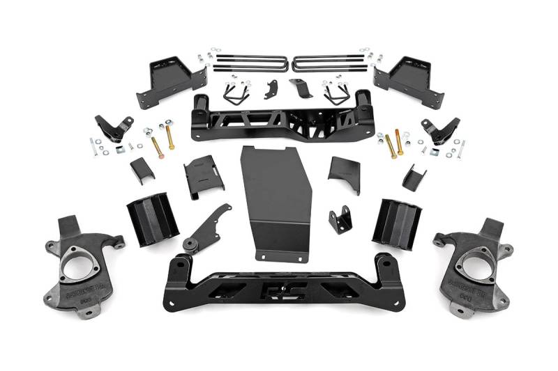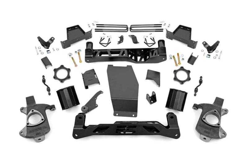 Get the look you really want with Rough Country's 6-inch Suspension Kit for GMC Sierra Denali 1500 Pickups equipped with Magnetic Ride Control. This massive kit affords your truck the ability to run 33-inch tires on factory wheels with our beefy lifted knuckles and is designed with 100% laser-cut materials for the best possible fit on your vehicle.Includes a set of front and rear high-clearance crossmembers featuring the "RC" logo and a differential skid-plate. Each kit also comes with a set of durable, fabricated lift blocks that are stronger and offer a longer lifespan than cast blocks.Give your pickup an aggressive, lifted and level stance with incredible ride quality! Our innovative Lifted Knuckle design boosts ride height while keeping all components at the optimum angles for a factory-like ride. Includes Rough Country's Lifetime Replacement Warranty.