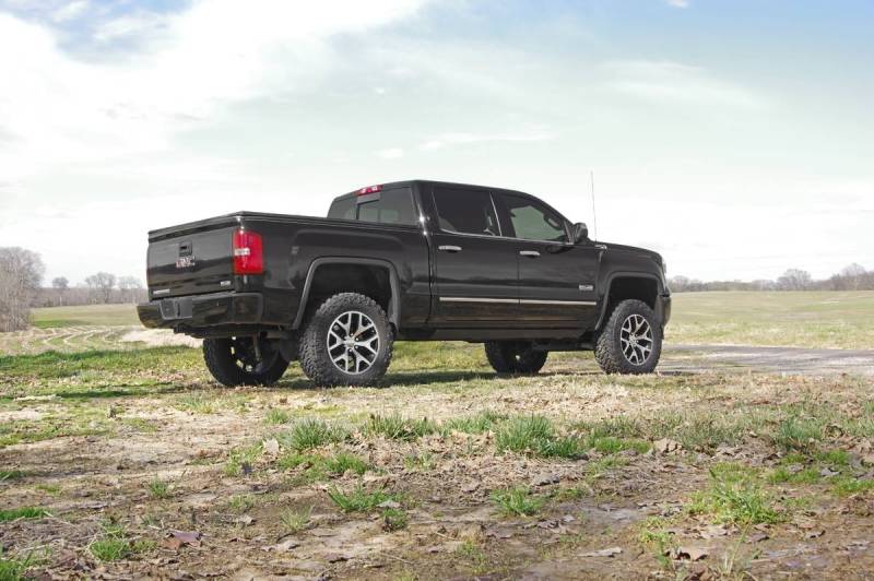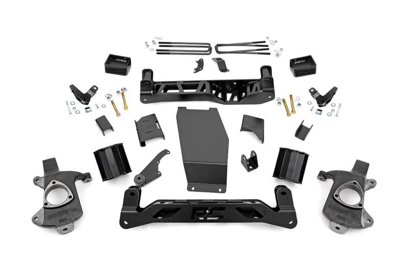 Get the look you really want with Rough Country's 5-inch Suspension Kit for GMC Sierra Denali 1500 Pickups equipped with Magnetic Ride Control. This massive kit affords your truck the ability to run 33-inch tires on factory wheels with our beefy lifted knuckles and is designed with 100% laser-cut materials for the best possible fit on your vehicle.Includes a set of front and rear high-clearance crossmembers featuring the "RC" logo and a differential skid-plate. Each kit also comes with a set of durable, fabricated lift blocks that are stronger and offer a longer lifespan than cast blocks.Give your pickup an aggressive, lifted and level stance with incredible ride quality! Our innovative Lifted Knuckle design boosts ride height while keeping all components at the optimum angles for a factory-like ride. Includes Rough Country's Lifetime Replacement Warranty.