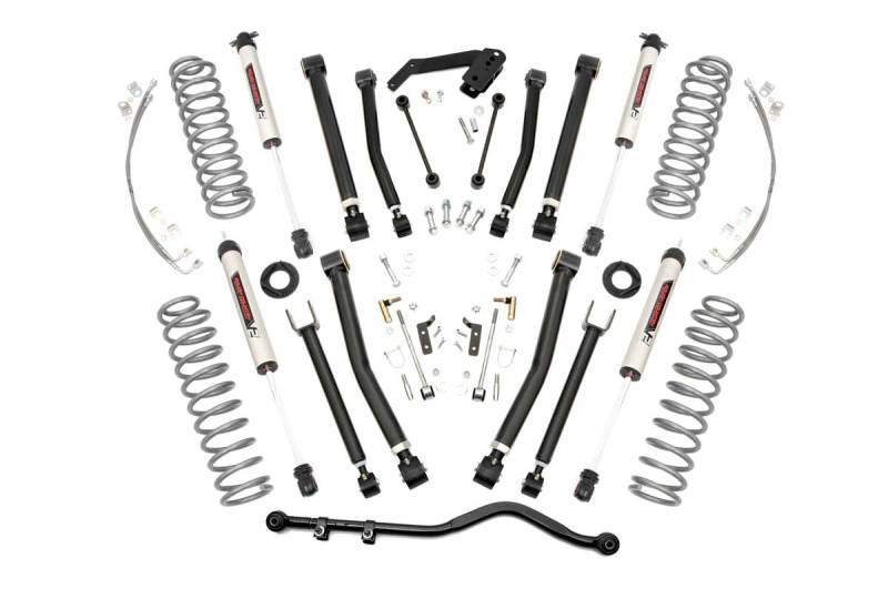 Total transformation on and off the trail starts with Rough Country's 4-Inch X-Series Suspension Lift Kit for Jeep. This all-inclusive package delivers aggressive styling, increased ground clearance, and enhanced off-road capability for the ultimate upgrade.Precision Adjustable Control Arms: This kit includes front and rear upper and lower X-Flex Control Arms featuring a high-clearance design. Built with OEM-style rubber bushings, fully rebuildable flex joints, and massive 2.5-inch diameter bodies with 1.25-inch threads, these arms are fully greasable for long-lasting durability and superior articulation. Fine-tune your ride height and suspension geometry with ease.Optimized Suspension Geometry: Lifted coil springs and rear coil correction plates provide the perfect combination of ride height and vibration dampening. The correction plates adjust the rear coil spring angle by 10 degrees, allowing for optimal suspension performance across any terrain.Heavy-Duty Forged Adjustable Track Bar: Strength and stability are delivered by a 16-pound forged solid steel Adjustable Front Track Bar. This heavy-duty component outmatches stock parts, maintaining precise axle alignment and control even during extreme off-road flexing. It's fully adjustable on the vehicle and easy to install.Custom Shock Options for Any Terrain: Select from nitrogen-charged N3 shocks, V2, M1 Monotube, or premium M1R shocks to match your driving style. From versatile daily comfort to maximum off-road control, this kit lets you tailor your suspension for any adventure.Confident, Balanced Stance: This lift kit levels the front of your Jeep with the rear, creating a commanding, well-balanced look that performs as good as it looks.Peace of Mind Guaranteed: Backed by Rough Country's Limited Lifetime Replacement Warranty, you can hit the trails knowing your investment is protected.