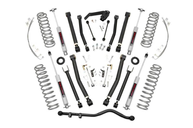Total transformation on and off the trail starts with Rough Country's 4-Inch X-Series Suspension Lift Kit for Jeep. This all-inclusive package delivers aggressive styling, increased ground clearance, and enhanced off-road capability for the ultimate upgrade.Precision Adjustable Control Arms: This kit includes front and rear upper and lower X-Flex Control Arms featuring a high-clearance design. Built with OEM-style rubber bushings, fully rebuildable flex joints, and massive 2.5-inch diameter bodies with 1.25-inch threads, these arms are fully greasable for long-lasting durability and superior articulation. Fine-tune your ride height and suspension geometry with ease.Optimized Suspension Geometry: Lifted coil springs and rear coil correction plates provide the perfect combination of ride height and vibration dampening. The correction plates adjust the rear coil spring angle by 10 degrees, allowing for optimal suspension performance across any terrain.Heavy-Duty Forged Adjustable Track Bar: Strength and stability are delivered by a 16-pound forged solid steel Adjustable Front Track Bar. This heavy-duty component outmatches stock parts, maintaining precise axle alignment and control even during extreme off-road flexing. It's fully adjustable on the vehicle and easy to install.Custom Shock Options for Any Terrain: Select from nitrogen-charged N3 shocks, V2, M1 Monotube, or premium M1R shocks to match your driving style. From versatile daily comfort to maximum off-road control, this kit lets you tailor your suspension for any adventure.Confident, Balanced Stance: This lift kit levels the front of your Jeep with the rear, creating a commanding, well-balanced look that performs as good as it looks.Peace of Mind Guaranteed: Backed by Rough Country's Limited Lifetime Replacement Warranty, you can hit the trails knowing your investment is protected.