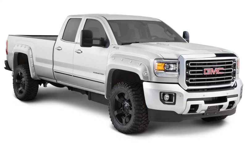 Bushwacker's rugged, iconic Pocket Style Fender Flares allow for more tire coverage and more clearance for trucks and SUVs while protecting the vehicle from dirt and debris. These flares are now available pre-finished to match the paint on your new GMC Sierra, plus they have the edge trim and stainless steel hardware pre-installed for quick and easy installation and a perfect fit . Made from sturdy Dura-Flex 2000 material, these flares are warp-resistant and tailor made for each application. Despite their bolted-on appearance, these flares install easily with minimal drilling for a secure fit. And since they're ready to install out of the box, there's no waiting on paint, and no hassle with installation.