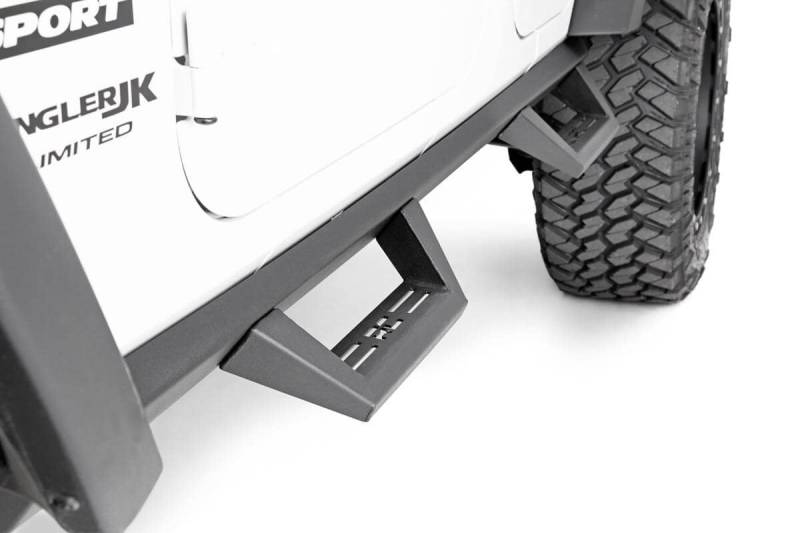 Get a one-of-a-kind, unique look for your Jeep JK with Rough Country's Contoured Drop Steps. These stylish wheel-to-wheel steps offer a unique look for your vehicle, with two integrated drop steps to help you easily climb into your cab.This step was engineered with a discrete, contoured design to perfectly complement the body lines of your Jeep JK, offering a tight, flush fit that looks good enough to be a factory option!Each integrated step is fabricated for strength and durability, and features a laser cut, accented RC logo for a one-of-a-kind look and feel.These durable steel steps offer unrelenting reliability, and are powdercoated black to resist corrosion for a long life of great looks. Rough Country Steps include a Lifetime Replacement Warranty!\ \