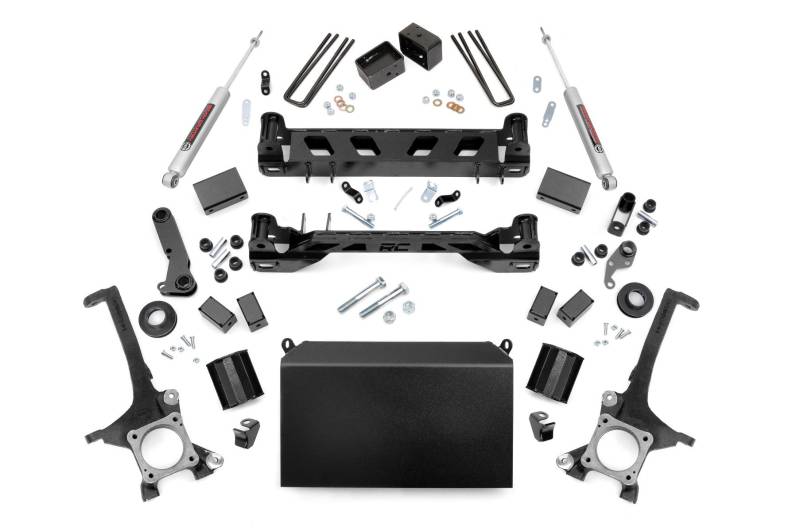 Take your Toyota Tundra to the next level with Rough Country's 6in Suspension Lift for 07 & up models. With heavy-duty components and a high-clearance design, this kit offers aggressive looks, unparalleled off-road performance, and enough ride height to run up to 35in tires.Instantly gain a meaner lifted and level stance with high-quality equipment that's made to handle the hazards of high-performance while withstanding the test of time. A set of durable lifted knuckles, high-clearance front and rear crossmembers, upper strut spacers, and long-lasting, fabricated rear blocks give you plenty of lift and uncompromised toughness.This all-inclusive kit features everything you need to take your Tundra off the tread and through the trenches; featuring steering stops, brake line brackets, differential drop brackets, sway-bar drop brackets, and anything else one would need to keep everything working at optimum angles after lifting. Best of all, you can get up and running with Rough Country's 6in Toyota Tundra Lift at a price that won't break the bank!