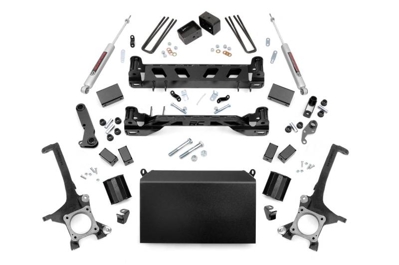 You'll never look at a Tundra the same way after installing Rough Country's 4-inch Toyota Tundra kit. This all-inclusive kit is a total transformation for your truck, with durable lifted knuckles, protective skid plate, and all the brackets and hardware needed to set your truck to a factory-like geometry while providing additional ground clearance. The beefy front crossmember features a high-clearance design to help traverse off-road obstacles with no hang-ups.Run larger wheels and tires while giving your truck a one-of-a-kind look and exceptional off-road performance. This kit affords your truck an aggressive appearance and a higher profile that is sure to demand attention. This kit includes Rough CountryΓÇÖs Nitrogen-charged N3 Shocks for the ultimate balance in highway ride quality and off-road vibration dampening. Includes Rough CountryΓÇÖs Lifetime Replacement Guarantee.