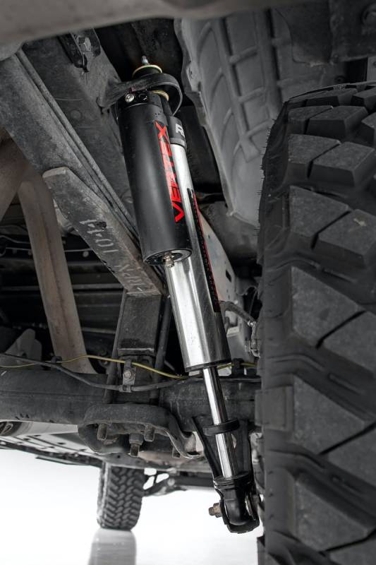 Unrivaled Ride Quality and Precision Tuning: Experience the pinnacle of off-road performance and on-road comfort with Rough Country's 2.5 Vertex Reservoir Shocks. Engineered for enthusiasts who demand elite performance without breaking the bank, these premium shocks deliver smooth handling and rugged durability across any terrain.Built to Dominate, Designed to Impress: Each shock features a massive 2.5-inch piston and high-flow 18mm chrome-hardened piston rod, offering unmatched shock control and fade resistance. The monotube design with external remote reservoir ensures superior heat dissipation and consistent performance, while Nitrogen-charged internals boost response and minimize shock fade in aggressive conditions. Durability That Goes the Distance: A 3-stage fortified seal system keeps out contaminants, extending the life of the shock even in the harshest environments. The honed steel body, paired with heat-treated alloy bearings, provides lasting strength, while a zinc-plated finish with double clear coat and over 400-hour salt spray rating ensures unbeatable corrosion resistance.Premium Styling with Rugged Substance: More than just performance, Vertex shocks stand out with CNC-machined billet aluminum accents, a laser-etched RC logo, and matching "Vertex" decals. Steel-braided reservoir lines and laser-cut brackets on the rear shocks elevate both form and function.Confidence Backed by Coverage: Rough Country backs the Vertex Shocks with an industry-leading 3-year manufacturer's warranty, so you can hit the trail or street knowing your suspension is ready for anything.