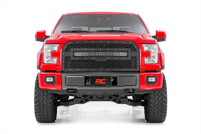 Give the front-end of your Ford F-150 a unique look with Rough CountryΓÇÖs Mesh Grille kit! This easy to install grille replacement kit swaps out your stock grille with the eye-catching, head-turning good looks of this aftermarket upgrade. With a unique, laser-cut mesh pattern surrounded by stylish, stainless steel rivets, this grill gives your truck a more menacing look thatΓÇÖs sure to draw attention.This kit features a Rough Country's 30ΓÇ¥ Curved Dual-Row Black-Series LED light bar with Cree LED's outputting a staggering 14,400 Lumens and 180 Watts of lighting power. Includes a mountable on/off switch, wiring harness, and our 3 Year LED Warranty!This easy-to-install grille requires no cutting or drilling and can be returned to stock at any time. Each kit is powdercoated black to resist corrosion and give a long lifespan of good looks. This kit also allows you to retain your active grille shutter system and front camera and features Rough CountryΓÇÖs Lifetime Replacement Warranty! \ \