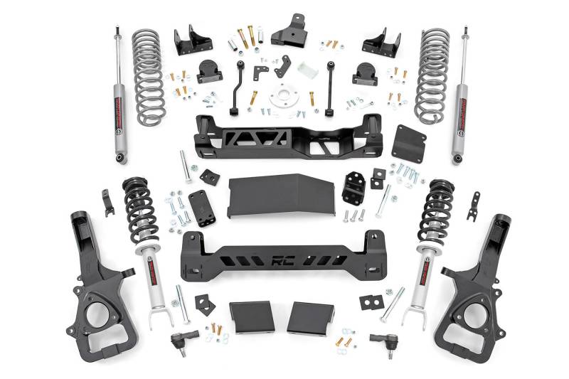 Transform your 5th generation RAM 1500 into an unstoppable off-road BEAST with Rough Country's complete 6in Suspension Lift Kit. This all-inclusive system delivers an aggressive, commanding stance that perfectly complements your truck's rugged new design.Preserve Your Smooth Factory Ride: Experience the same comfortable and controlled driving feel you love. Our kit maintains a smooth factory-like ride quality so every journey, on-road or off, is just as comfortable as before.Boost Your Ground Clearance for Ultimate Off-Road Confidence: Gain plenty of added clearance to tackle the toughest trails and obstacles with ease. The 6-inch lift lets you run up to massive 35-inch tires for a bold look and enhanced off-road capability.Achieve a Balanced, Aggressive Stance: Level your RAM's front and rear for a sleek, aggressive profile that turns heads everywhere you go. The kit includes precision-engineered front and rear crossmembers, each laser-cut with the iconic RC logo for a fierce yet streamlined appearance.Optimized Ride Quality with Application-Specific Springs: Enjoy improved handling, ride comfort, and load support thanks to dual-rate rear coil springs (optional upgrade) tailored for your RAM. Whether cruising highways or conquering rocky terrain, this kit adapts seamlessly.Fully Configurable with Premium Shock Options: Customize your ride quality with shock absorbers that match your driving style, from nitrogen-charged N3 shocks for balanced performance to the premium Vertex reservoir shocks for the ultimate ride.Enhanced Steering and Fitment: An upgraded outer tie-rod reduces bump steer and optimizes turning precision. Plus, it allows you to fit a wider variety of wheels without compromise.Clean Installation with Long-Term Durability: All components are designed with drop brackets and proper geometry to keep your truck looking sharp and functioning flawlessly, no loose parts or unsightly hangers. Backed by Rough Country's Limited Lifetime Replacement Guarantee, this kit is built to last.Upgrade your RAM 1500 with Rough Country's 6in Suspension Lift Kit, dominate the trails, look the part, and drive like a champion every mile of the way.