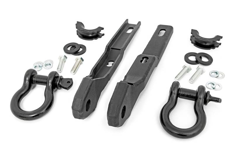 Give your vehicle an upgraded recovery option that offers a more aggressive look with Rough Country's Tow Hook to Shackle Conversion Kit!\ This easy-to-install upgrade replaces your factory tow hooks with a durable d-ring shackle mount that's easier to access and gives the front of your vehicle an eye-catching look. Rough Country's Shackle Mount bolts directly to the frame providing the same strength and durability as your factory tow hooks to aid in recovery in any situation. Each mount is powder coated black for a long lifespan of good looks and is designed to work with both factory and many aftermarket bumpers. The mounting point was engineered to accept any 3/4in d-ring shackle, allowing you to customize the look of your vehicle.\ Featuring a 100% bolt-on installation process, this great-looking upgrade can be installed in a flash! Simply remove the factory tow hooks and install Rough Country's Tow Hook to Shackle Conversion Kit into the factory tow hook mounting points and you're ready to roll! Best of all, each mount is covered by Rough Country's Lifetime Replacement Guarantee!