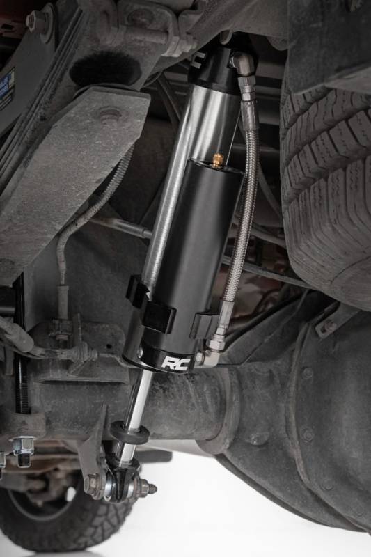 Unrivaled Ride Quality and Precision Tuning: Experience the pinnacle of off-road performance and on-road comfort with Rough Country's 2.5 Vertex Reservoir Shocks. Engineered for enthusiasts who demand elite performance without breaking the bank, these premium shocks deliver smooth handling and rugged durability across any terrain.Built to Dominate, Designed to Impress: Each shock features a massive 2.5-inch piston and high-flow 18mm chrome-hardened piston rod, offering unmatched shock control and fade resistance. The monotube design with external remote reservoir ensures superior heat dissipation and consistent performance, while Nitrogen-charged internals boost response and minimize shock fade in aggressive conditions.Durability That Goes the Distance: A 3-stage fortified seal system keeps out contaminants, extending the life of the shock even in the harshest environments. The honed steel body, paired with heat-treated alloy bearings, provides lasting strength, while a zinc-plated finish with double clear coat and over 400-hour salt spray rating ensures unbeatable corrosion resistance.Premium Styling with Rugged Substance: More than just performance, Vertex shocks stand out with CNC-machined billet aluminum accents, a laser-etched RC logo, and matching "Vertex" decals. Steel-braided reservoir lines and laser-cut brackets on the rear shocks elevate both form and function.Confidence Backed by Coverage: Rough Country backs the Vertex Shocks with an industry-leading 3-year manufacturer's warranty, so you can hit the trail or street knowing your suspension is ready for anything.