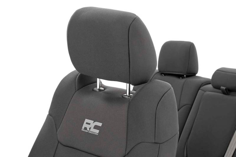 Want to protect your seats or are your seats showing signs of wear and tear from daily use? Say goodbye to unsightly stains and deterioration with Rough Country's Neoprene Seat Covers - the ultimate solution for preserving your vehicle's interior.Snug Fit for Optimal Protection: Our seat covers are tailored to fit your seats perfectly, providing a protective barrier against spills, scratches, and everyday wear and tear.Factory-Spec Construction: Engineered to meet factory specifications, our covers blend seamlessly with your vehicle's interior, giving it a fresh, new look without compromising on quality or style.Four-Layer Defense: With a four-layer construction featuring foam padding and a durable polyester shell, our seat covers offer unmatched protection and longevity, ensuring your seats stay looking new for years to come.Breathable and Water-Resistant: The neoprene layer not only provides breathability for added comfort but also boasts water-resistant properties, safeguarding your seats from spills and stains.Complete Coverage: Our covers come with full protection for your front seats, including headrest covers where applicable, as well as rear covers to shield your back seats from children and pet-related mishaps.Peace of Mind Warranty: Rest easy knowing your purchase is backed by our two-year warranty, giving you confidence in the durability and reliability of our product.Don't let worn-out seats diminish your driving experience. Upgrade to Neoprene Seat Covers today and enjoy a fresh, stylish interior that's protected against the rigors of daily life on the road.