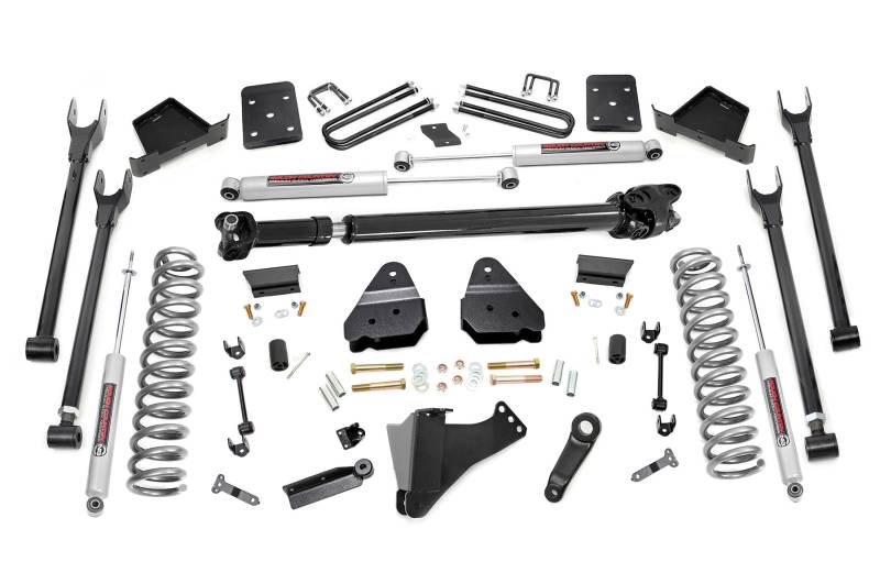 Gain greater travel and improved handling while adding ground clearance and aggressive style with Rough Country's 4-Link F-250 Lift Kit.This innovative kit allows you to replace your factory arms with a 4-Link setup, using Rough Country's durable, fixed upper arms and adjustable lower control arms. A set of radius arm drop brackets maintain proper geometry and allow for proper caster setting, which is crucial to maintain factory handling.This kit includes a set of lifted coil springs, radius arm drop-brackets, and ultra-durable, fabricated Anti-wrap rear blocks that prevent binding and axle wrap. This kit also includes stainless steel extended brake lines and brake line brackets to ensure you have everything you need to install your lift. Best of all, this kit features Rough Country's Nitrogen-Charged N2.0 Shock Absorbers for the ultimate balance in off-road performance and a smooth highway ride. Includes Rough Country's Lifetime Replacement Warranty