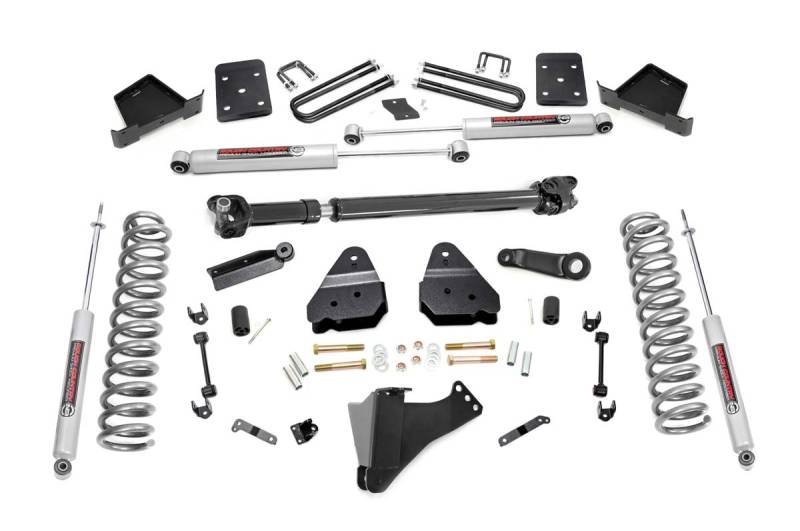 Take your truck to new heights with Rough Country's 6in Suspension Lift! This all-inclusive kit comes with everything you need for a total trasnformation of your truck. Run up to 37in tires while preserving the smooth, factory ride quality with this impressive upgrade.\ When changing a vehicle's suspension, the key to preserving ride quality is keeping the geometry of all suspension components as close to their factory angles as possible. Rough Country's new 6-inch Suspension Lift features a set of ultra-durable radius arms drop brackets, precision fit to bolt right into the factory mounts for an easier install and a more factory-like angle. \ This kit includes a set of lifted coil springs and ultra-durable, fabricated anti-wrap rear blocks that prevent binding and axle wrap. Best of all, this kit comes with your choice of Rough Country's N3, V2 Monotube, or Vertex Adjustable Reservoir shocks! Includes Rough Country's Lifetime Replacement Warranty