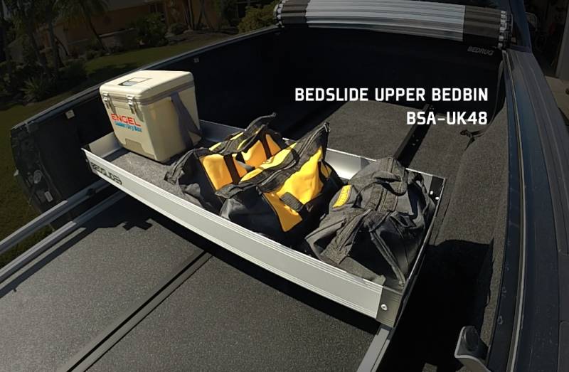 The BEDSLIDE upper BEDBIN adds an additional 16 x 48 bin that mounts above any BEDSLIDE with a GUARDRAIL or TRAXRAIL kit. The upper BEDBIN provides added storage space for smaller items while still providing full use of your BEDSLIDE deck space.