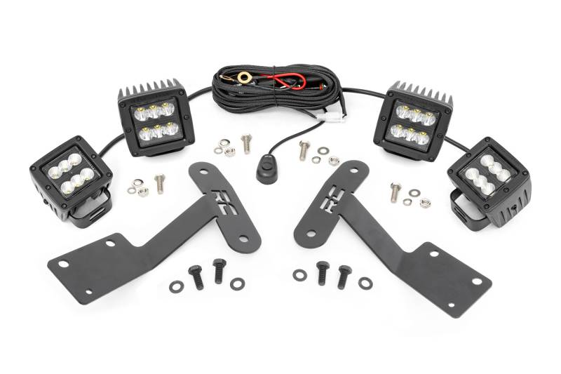 Whether it's off-road riding at night or navigating the trails after hours, Rough Country's Quad Cube LED Ditch Mounts gives you the strong side illumination you need. Never miss another turn, and safely maneuver through any off-road situation in the dark without obstructing visibility from inside the cab.\ This easy to install mounting system is low profile and features 100% bolt-on installation procedure, with no need for cutting or drilling needed. The LED Cubes tuck nicely along the base of the windshield and pack an impressive 5,760 lumens and 72 watts of lighting power. Each Rough Country LED light cube is IP67 Waterproof and includes a premium, braided wiring harness with in-line fuse and on/off switch.\ This kit Includes Rough Country's 3-year LED warranty.