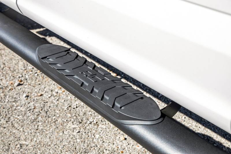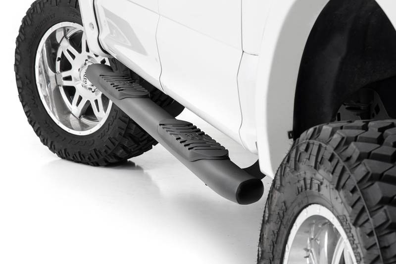 Gain easier access to your cab with the classic, OEM look of Rough Country's Oval Nerf Step Bars. These durable, steel side steps feature a comfortable, 4.5-inch wide stepping area built into a large, tubular nerf rail that mimics the look of the popular OEM oval step design.\ Each nerf board features a long-lasting black powder coat and durable steel construction that can support up to 500lbs! Each step offers a 30-degree angled end design looks great on any vehicle. A secure, 4.5-inch wide stepping area features a non-slip pad to ensure a confident footing each and every time.