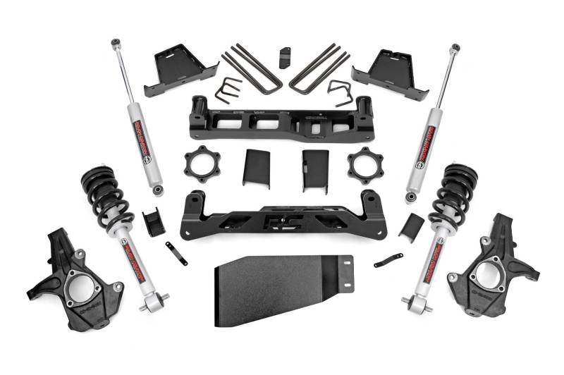 Aggressive Stance Meets Daily Comfort: Unlock the perfect blend of form and function with Rough Country's 6-Inch Suspension Lift Kit for Chevy Silverado 1500/GMC Sierra 1500 pickups. This kit supports up to 295/60R20 tires on factory 20-inch wheels, giving your truck a bold, commanding presence without the need for aftermarket wheels.Level and Trail-Ready in One Package: Say goodbye to factory rake this lift achieves a clean, leveled stance from front to rear while maximizing clearance thanks to high-clearance crossmembers and laser-cut lifted knuckles engineered for a precision fit. Built for trail performance and street appeal, every component is crafted using advanced CAD technology for unmatched durability.Hassle-Free Installation with No Compromises: Enjoy a smooth install with no need to modify your drivetrain, exhaust, or differential. The kit is designed for a straightforward bolt-on setup no strut disassembly required saving you time and effort in the garage. Engineered for Strength and Stability: Tackle rough terrain with confidence using heavy-duty fabricated lift blocks that outlast traditional cast designs. Anti-axle wrap rear blocks preserve factory ride comfort while solving common lift-related issues.Customize Your Ride Quality: Dial in your suspension with configurable shock and strut options, including our nitrogen-charged N3 series or the high-performance M1 Monotube, so you get the ride feel that matches your driving style.Backed by Confidence: As always, this kit includes Rough Country's Limited Lifetime Replacement Warranty, ensuring peace of mind on every mile.