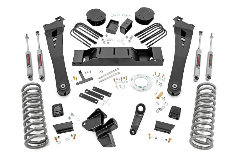 Compliment your RAM 3500's aggressive, good looks with Rough Country's 5-inch Radius Arm Lift Kit. RAM Trucks come with a wealth of impressive features right from the factory. RAM Trucks come with a wealth of impressive features right from the factory. Rough Country's new 5-inch kit was engineered to retain these impressive factory specs while bumping up performance and durability where it's needed most. The result is a lifted beast with a mean profile and lush ride-quality that'll make other RAM owners wonder where you got yours from!\ When changing a vehicle's suspension, the key to preserving ride quality is in keeping the geometry of all suspension components as close to their factory angles as possible. Rough Country's 5-inch Suspension kit features a set of ultra-durable Radius Arms, precision fit to bolt right into the factory mounts for an easier install and a more factory-like angle. These beefy, upgraded Radius Arms also feature a durable, durable rubber bushings for maximum vibration absorption. This kit also includes a set of front, lifted coil springs for unparalleled ride quality from your lifted Dodge Ram.