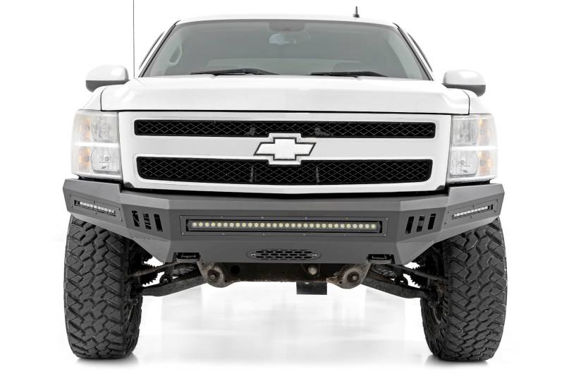 High Clearance Style Without the High Price: Instantly update the look of your Chevy Silverado 1500 with Rough Country's High Clearance Bumper. This aggressive pre-runner inspired upgrade delivers bold front-end styling and improved approach angles at a fraction of the cost of comparable aftermarket bumpers. Designed to install straight out of the box, it gives your truck a tougher, more capable appearance quickly and easily.Modular Design with Built-In Capability: Built with versatility in mind, Rough Country's High Clearance Bumper features a fully modular layout that lets you choose the configuration that best fits your build. Integrated trim plates and mounting locations allow you to run multiple LED lighting setups for enhanced visibility, while the included winch mounting plate is engineered to accept Rough Country PRO Series winches for added recovery confidence. An optional LED upgrade kit is available and includes one 30-inch single row LED and two 10-inch slimline LEDs for powerful forward illumination.Clean Finish with Upgrade Flexibility: Prefer a more streamlined appearance? The included trim panels allow you to block off lighting openings for a clean, finished look while preserving the option to add LEDs later. Each bumper is finished in a durable flat black powder coat that resists corrosion and trail abuse, with no painting required for a hassle-free install.Simple Bolt-On Installation with Warranty Protection: Designed for an easy bolt-on installation using factory mounting locations, this bumper installs with no cutting or drilling required. The optional LED lights are backed by a 3-year warranty, while the bumper includes a 1-year finish warranty and a limited lifetime warranty against manufacturing defects for added peace of mind.