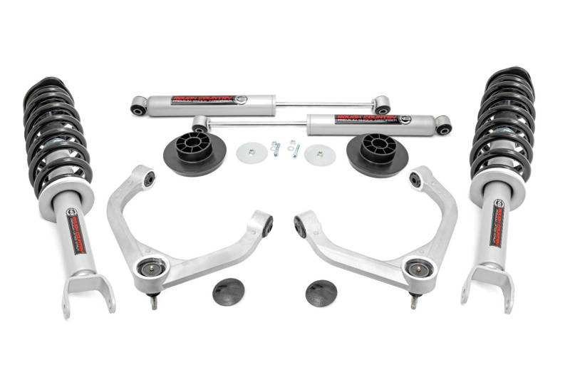 Rough Country's 3-Inch Bolt-On Kit delivers aggressive good looks, increased ground clearance, and an easy installation - all at an unbeatable value. Take your fourth-generation RAM 1500 to the next level with this premium lift kit, designed to enhance both on-road comfort and off-road capability. Increased Ground Clearance: Tackle rocky trails and rough terrain with confidence! This lift kit gives your RAM 1500 the extra height needed to clear obstacles effortlessly, improving both performance and protection. Front-to-Rear Leveling: Say goodbye to factory rake! This kit levels the front and rear of your truck, giving it a bold, aggressive stance that commands attention on and off the road. Premium Upper Control Arms: Equipped with forged aluminum upper control arms, this kit enhances strength and durability. These high-quality arms feature POM ball joints, providing a greater range of motion and smoother articulation for superior handling. These arms are also available in a red powder-coated finish for a custom look that stands out in the wheel wells. Pre-Installed Ball Joints: No hassle, no extra steps - our ball joints come pre-installed, making installation easier and ensuring long-term reliability.Hassle-Free Installation: Enjoy a bolt-on installation with no cutting or drilling required! This means less time in the garage and more time conquering trails.At Rough Country, we know every off-road journey is unique. That's why our 3-inch kit is fully adaptable, allowing you to choose between nitrogen-charged N3 shocks/struts for a smooth ride or M1 Monotubes for premium performance. With Rough Country, you're not just lifting your RAM - you're redefining your off-road experience.
