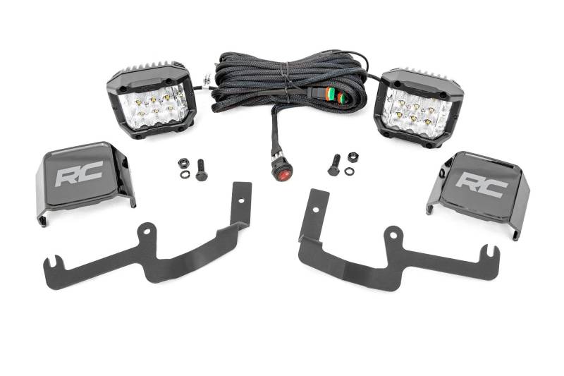 - Powerful Side Illumination: Ensures clear visibility for off-roading at night and during low-light conditions.\ Easy Installation: 100% bolt-on design, no cutting or drilling required for a quick setup.\ No Interference with Washer Nozzle: Designed to ensure proper function without disrupting the washer nozzle or spray pattern for optimal windshield cleaning performance.\ Durable LED Light Cubes: IP67 waterproof-rated for reliable performance in all weather conditions.\ Premium Wiring Harness: Includes a braided harness with an in-line fuse and on/off switch for convenient operation.\ Customizable Lighting Options: Available with Black Series LED Pods, OSRAM Pods, Spectrum Series, and DRL options.\ Low-Profile Mounting: Tucks neatly along the base of your windshield for a sleek, unobtrusive look.\ 3-Year Warranty: Backed by Rough Country's 3-year LED warranty for peace of mind..