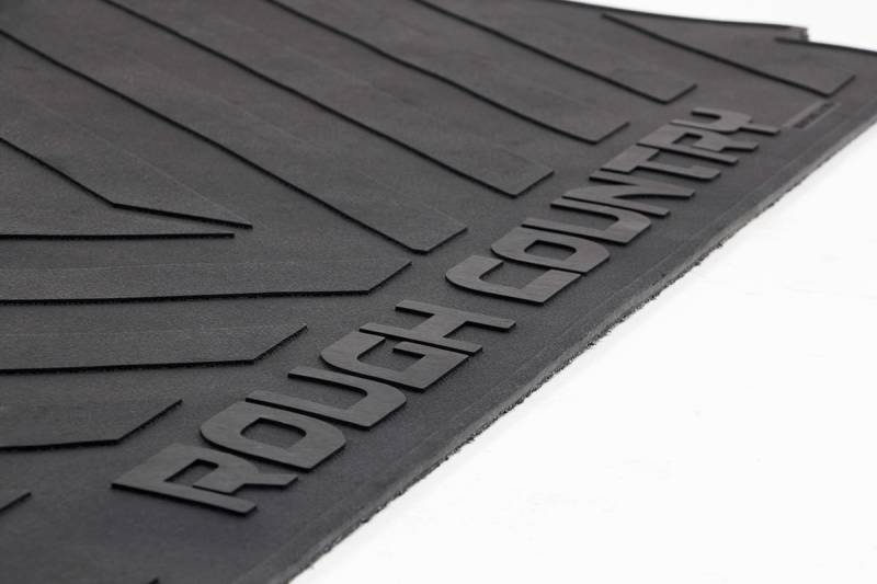 Innovative Design and Material. Keep your truck bed free from scuffs, scrapes, and scratches with Rough Country Truck Bed Mats. These heavy-duty, 3/8-inch thick, contoured rubber mats are nearly indestructible; made from a high-quality rubber compound that won’t crack in extreme temperatures or fade when exposed to the sun. This stylized bed mat features a large "RC" and "Rough Country" logo with angled lines for an improved look that also protects your truck bed.\ Installation. With a simple drop-in design, installation couldn't be easier. With an estimated timeframe of 10 minutes, this mat can be installed at home efficiently and quickly! Simply place the bed mat in, and roll it out and you're done!\ Limited Lifetime Replacement Warranty. Rough Country's bed mats are backed with a limited lifetime replacement warranty towards manufacturer defects. As such, the product is protected from structural and workmanship damage after the date of purchase. With our industry-leading warranty give yourself peace of mind when using Rough Country products!