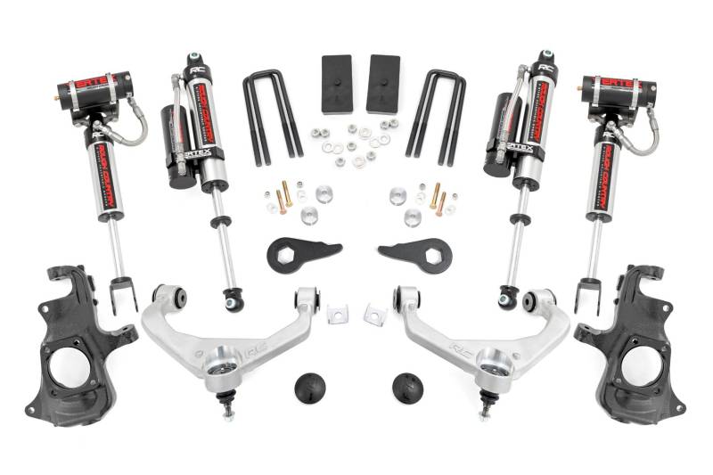 Improved Ground Clearance and Ride Quality: Transform your Sierra or Silverado 2500HD/3500HD with Rough Country's 3.5" Knuckle Lift Kit. Engineered to deliver increased ground clearance, this kit gives your truck the confidence to tackle off-road trails while maintaining smooth, reliable performance on the highway. Choose from Rough Country's premium shock options, N3, M1, V2 monotube shocks, or Vertex reservoir shocks, to match your driving style and maximize ride quality.Innovative Design and Superior Strength: Built for heavy-duty performance, this lift kit features precision-engineered steel knuckles and forged torsion bar keys for uncompromised durability. Forged upper control arms with OEM-style Clevite bushings maintain factory-like geometry and ensure a full range of motion. Differential drop spacers further optimize driveline angles while reducing CV bind. With clearance to run 33" tires (with proper wheel backspacing), your truck gains both function and aggressive style.Premium Control Arm Finishes: Customize your build with upper control arms available in a sleek aluminum finish or bold powdercoated red. Both options deliver rugged strength with a premium look to match your truck's style.Quick and Easy Installation: Designed for a straightforward bolt-on process, this kit requires no cutting, drilling, or welding. With an estimated install time of 4-6 hours and only standard tools needed, you can get your truck lifted and ready to go in a single afternoon.Backed by a Limited Lifetime Warranty: Drive with peace of mind knowing your Rough Country 3.5" Knuckle Lift Kit is protected by our industry-leading limited lifetime replacement warranty. Built tough and backed strong, this suspension system is made to perform as hard as your truck works.