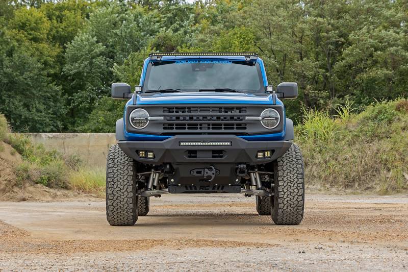 Superior Function and Looks. Who says you can't have a great-looking Bronco that also can conquer any task at hand. Here at Rough Country, we are providing jaw-dropping good looks and functionality with Rough Country's Hidden Winch Bumper for the all-new Ford Bronco!\ Durability and protection. Rough Country's Hidden Winch Bumper provides the best of both worlds offering a stylish new approach for equipping a recovery system to your vehicle. Featuring a standard 4.5in X 10in 4 bolt Winch Mount, our hidden winch bumper can fit most standard size winches up to 12,000 lbs and does NOT impede airflow to the intercooler. Boasting a massive 11 gauge thick powder-coated skid plate rest easy knowing that your Bronco's underbelly is well protected for any terrain. \ Installation. With a minor cutting required to install an estimated timeframe of 2-3 hours this full kit can be installed at home using standard tools and can be completed efficiently and quickly!\ Lifetime Replacement Warranty. Rough Country's Hidden Winch Bumper is backed with a lifetime replacement warranty towards manufacturer defects. As such, the product is protected from structural and workmanship damage after the date of purchase. With our industry-leading warranty give yourself peace of mind when using Rough Country's Suspension products! \